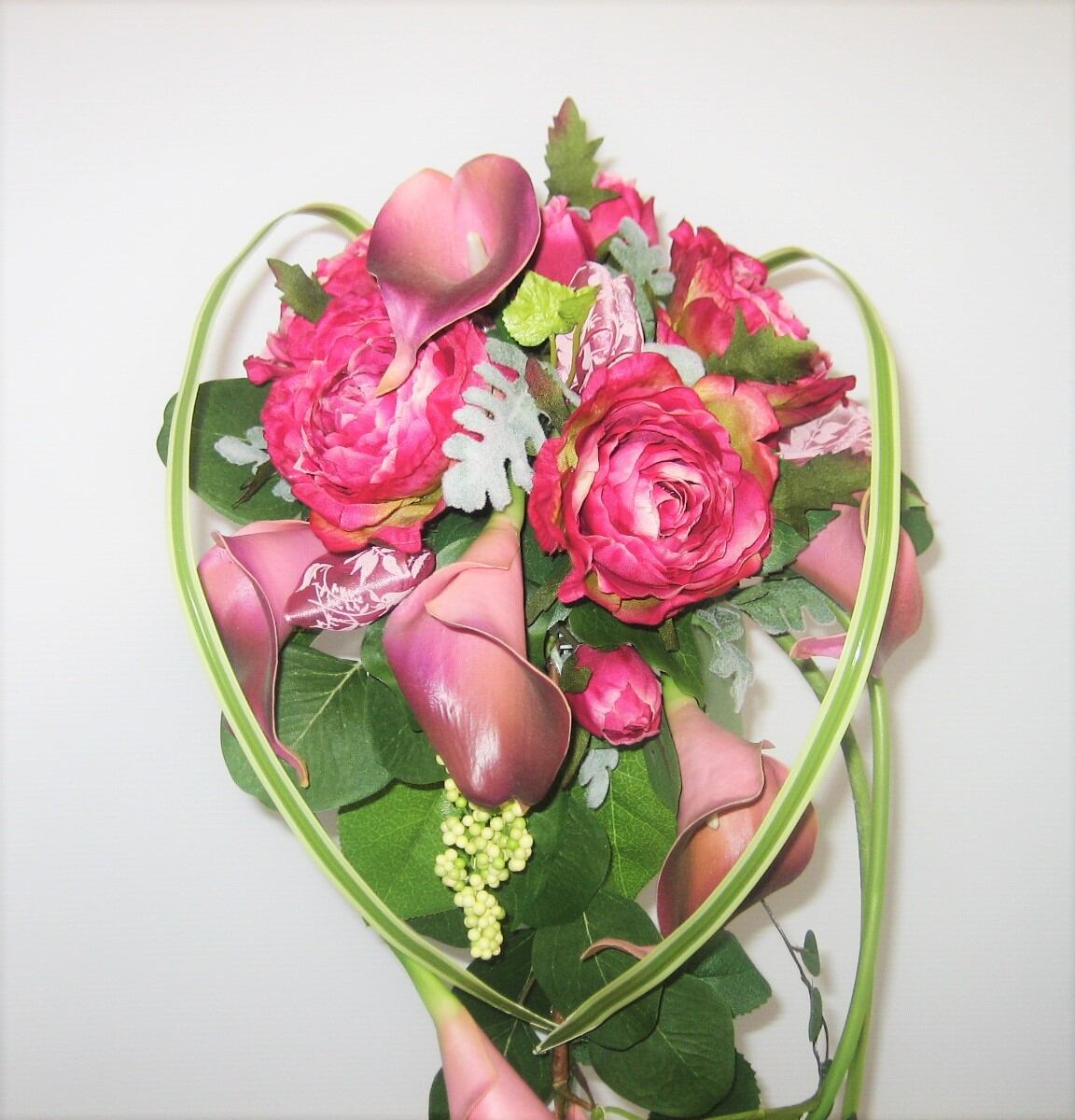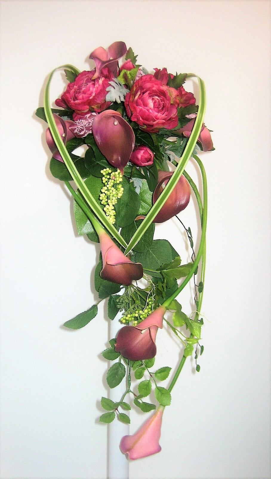 カラーリリーを使用したキャスケードタイプのブーケです。やはり何といってもキャスケード(流れるような小滝)をイメージして製作しました。曲線的な美しさが手にする女性の穏やかさに反映すると思われます。自信の一品です。