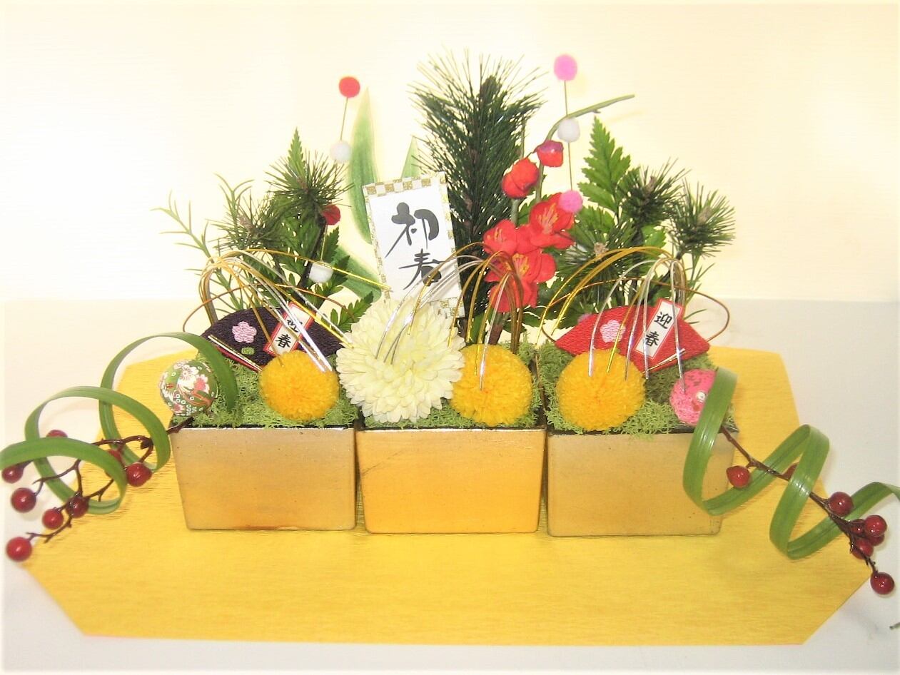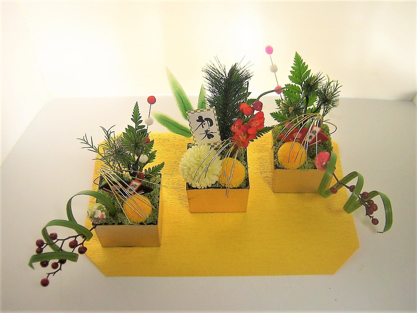 迎春用のアレンジメントです。三点で1セットになります。お客さの感性でレイアウトをなさってください。どのようなレイアウトでも、均整が取れて楽しく配置できるように考慮しました。 W36cm H20cm D20cm