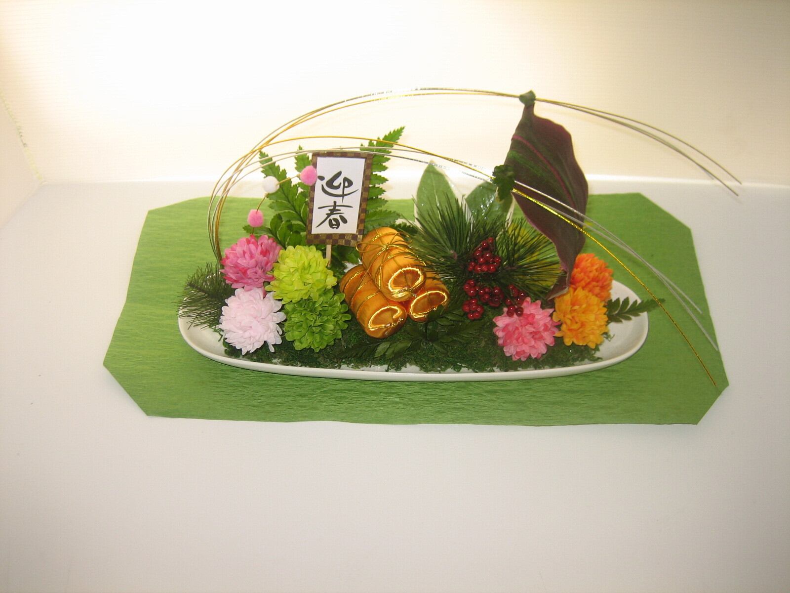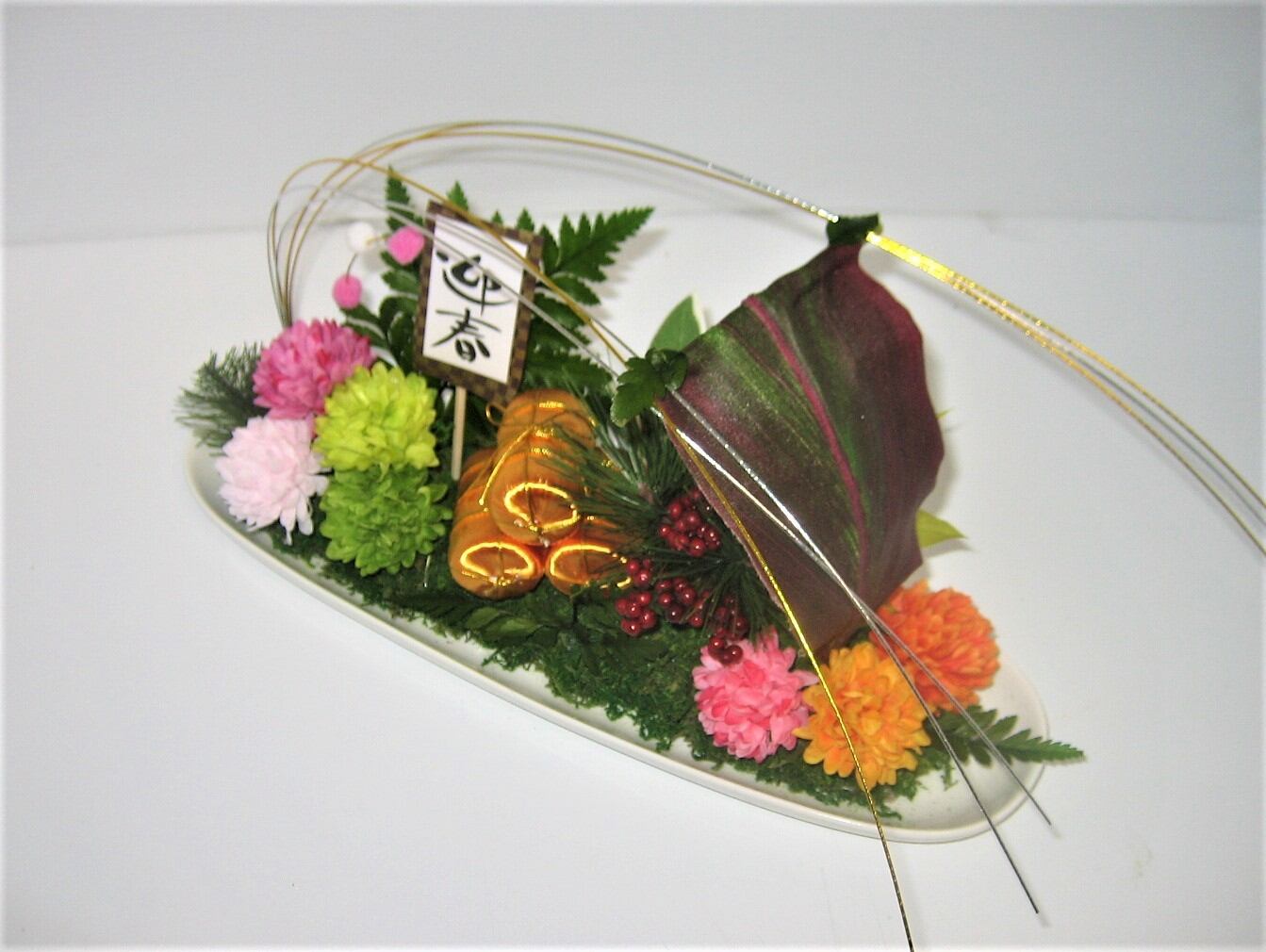 アーティフィシャルフラワーで宝船です。ドラセナのリーフを帆に見立て帆船の雰囲気を出しました。七福神ならぬ七福花神として七色の小花を添えました。金色の米俵がフォーカルポイントになってしまいました。 幅30cm 高さ18cm 奥行10cm