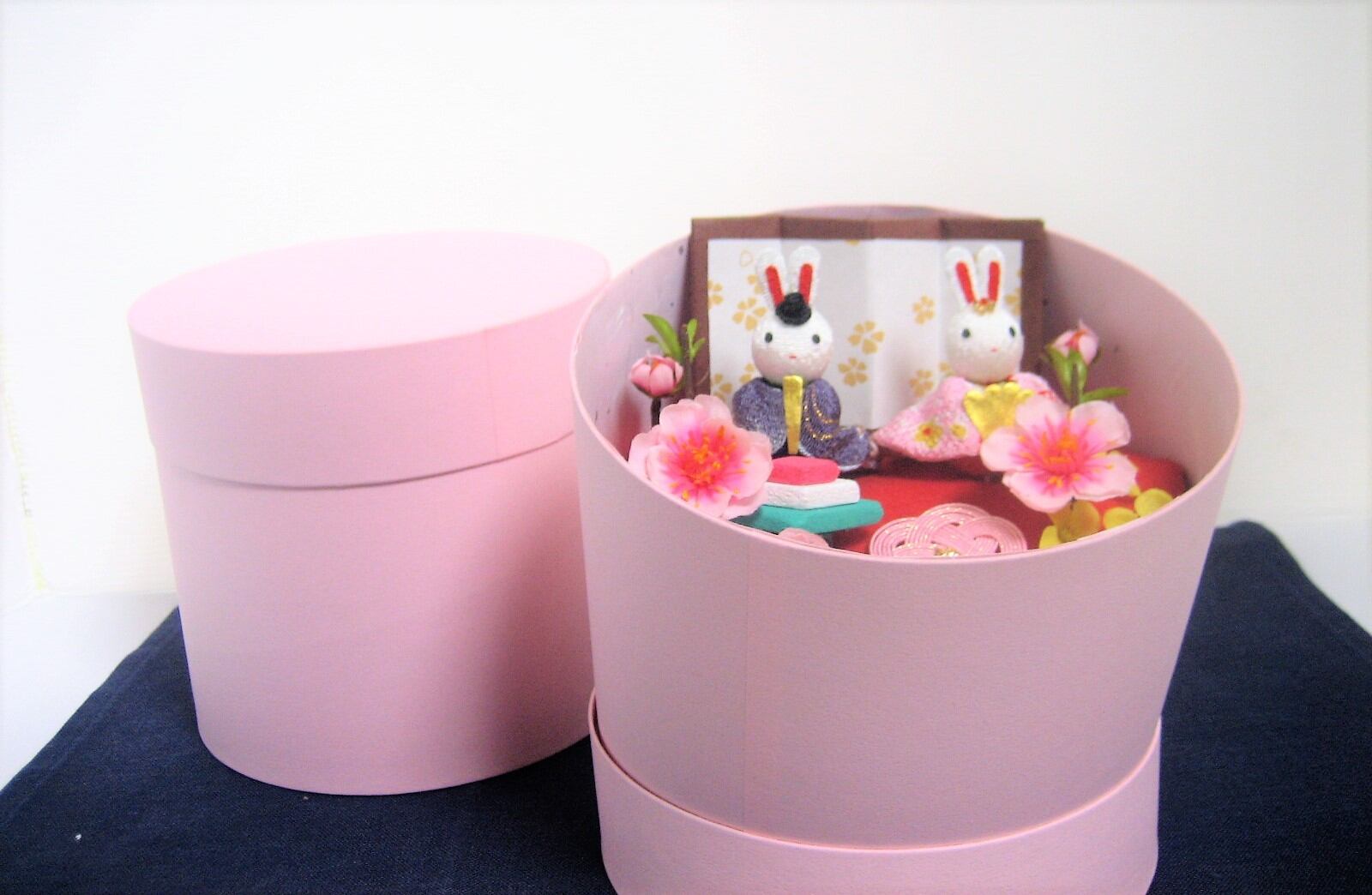 花いずもの雛飾り 【丸箱①兎】 (アーティフィシャルフラワー:桃花・菜花) 「竹取雛物語」