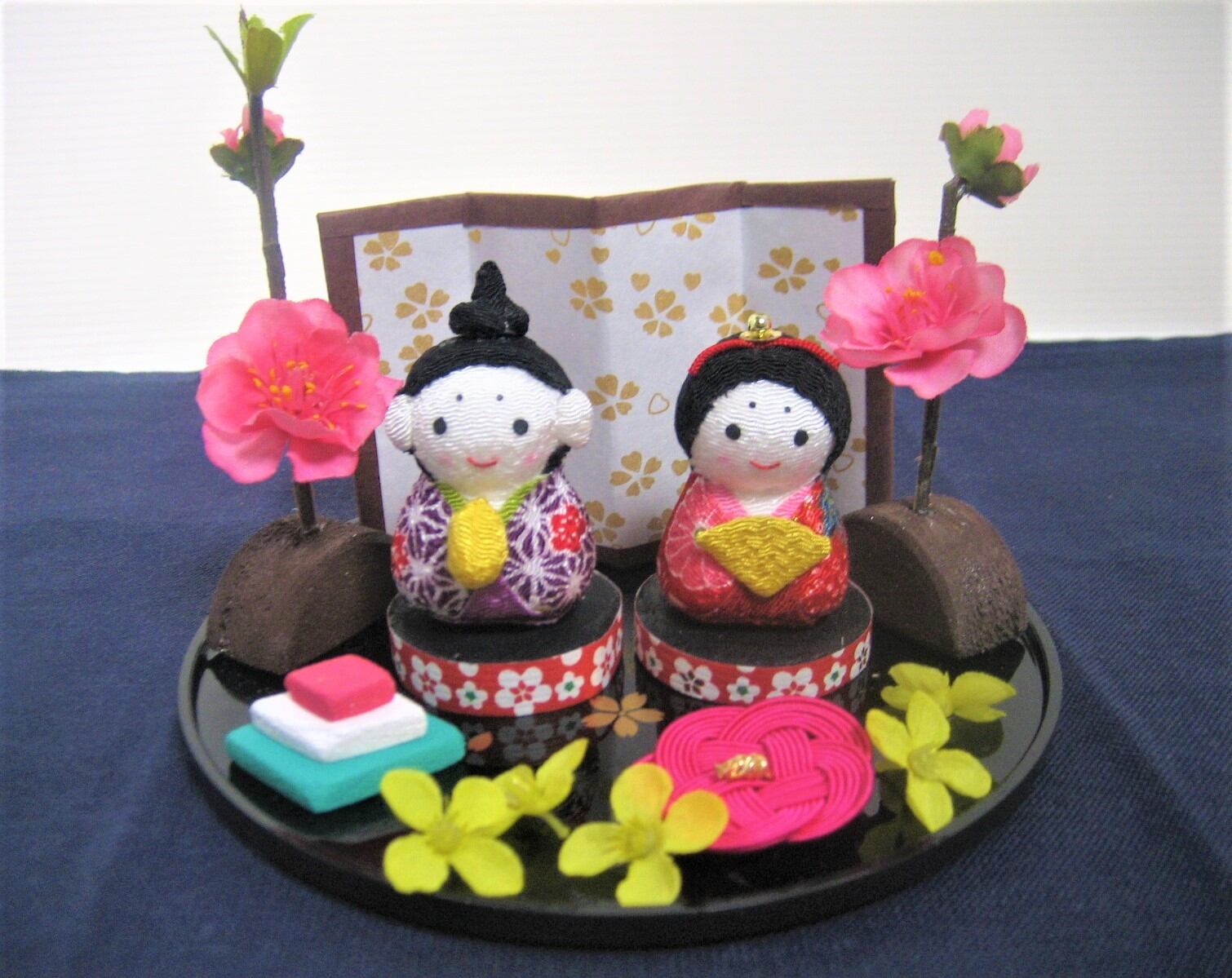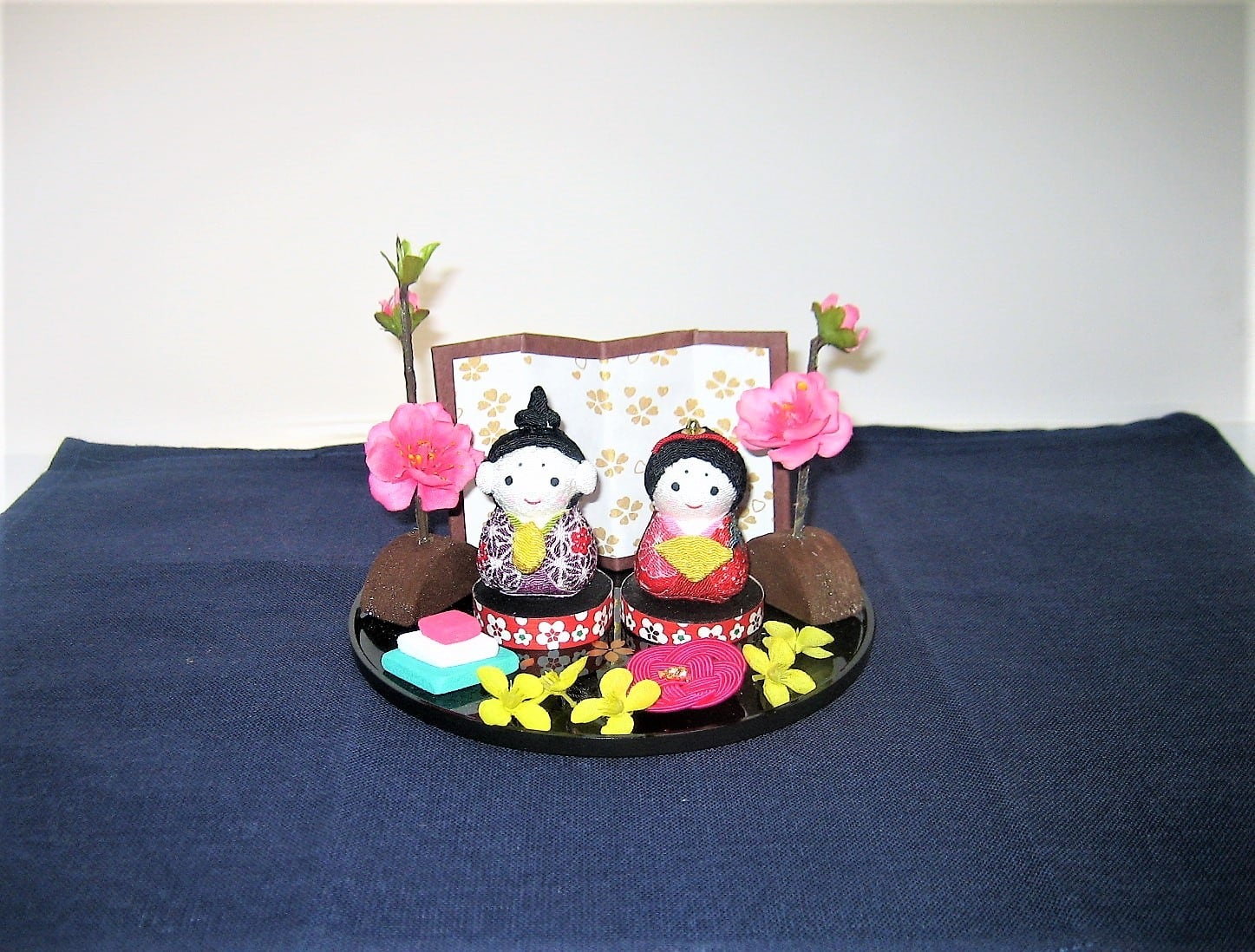 ちりめん細工のお内裏様とお雛様です。桃の花を雪洞に見立てました。微笑ましく可愛い品です。各パーツをそれぞれ包装しておきますので、ディスプレイは、お客様ご自身が楽しみながら設置してくださいね。