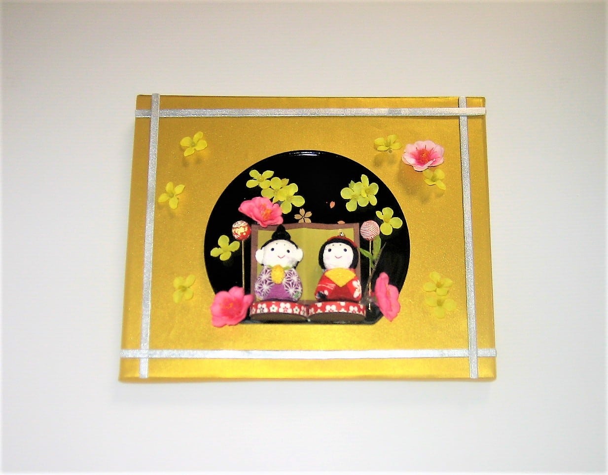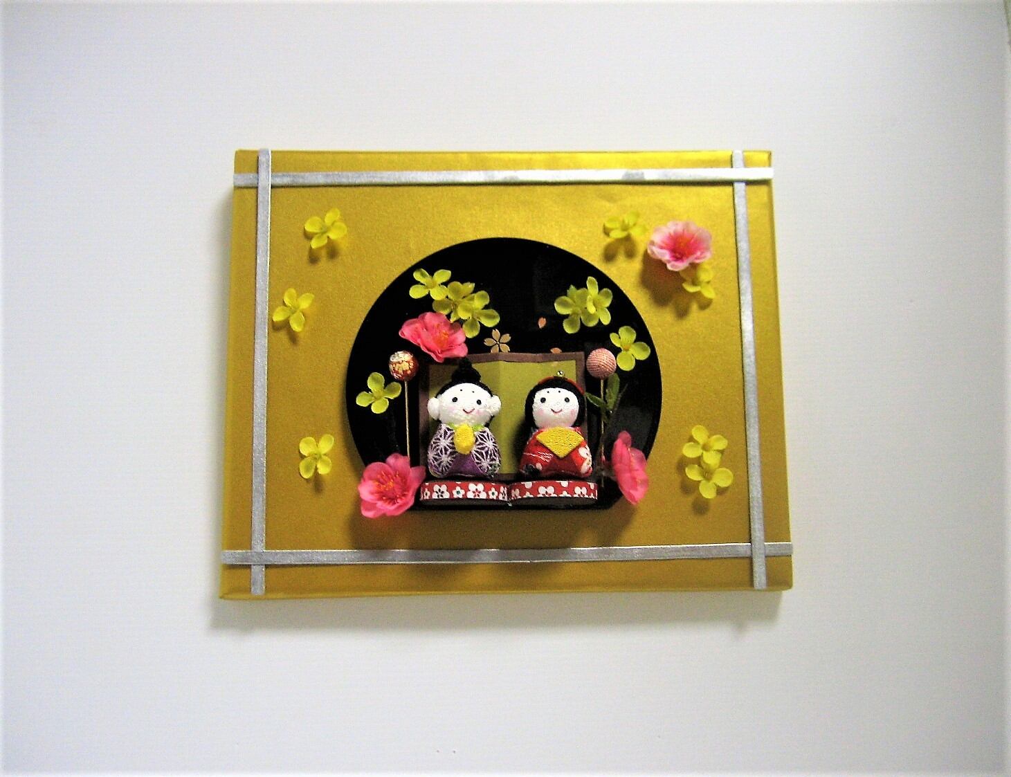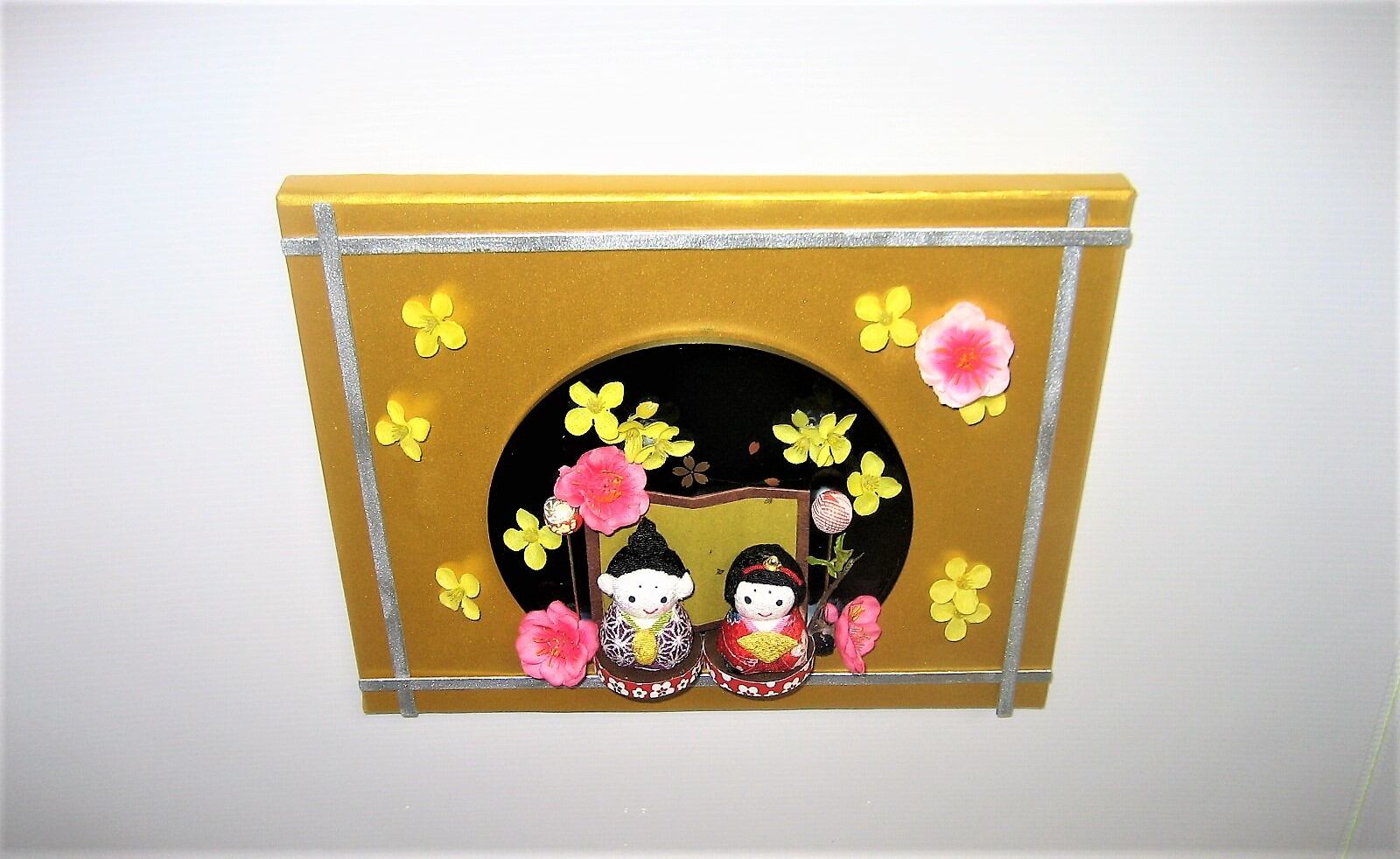 ちりめん細工のお内裏様とお雛様です。 金枠タイプの壁掛です。 井桁の文様が素朴感を伺えます。 限定 1品となります。 高さ 22cm 幅 27cm 奥行 5.5cm