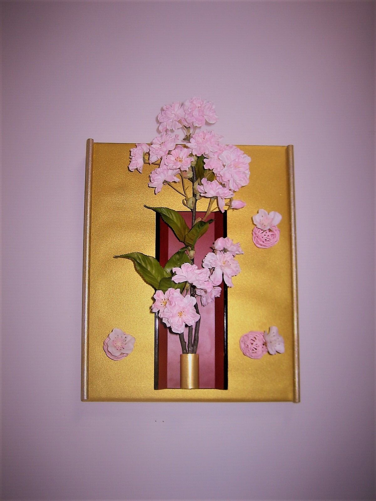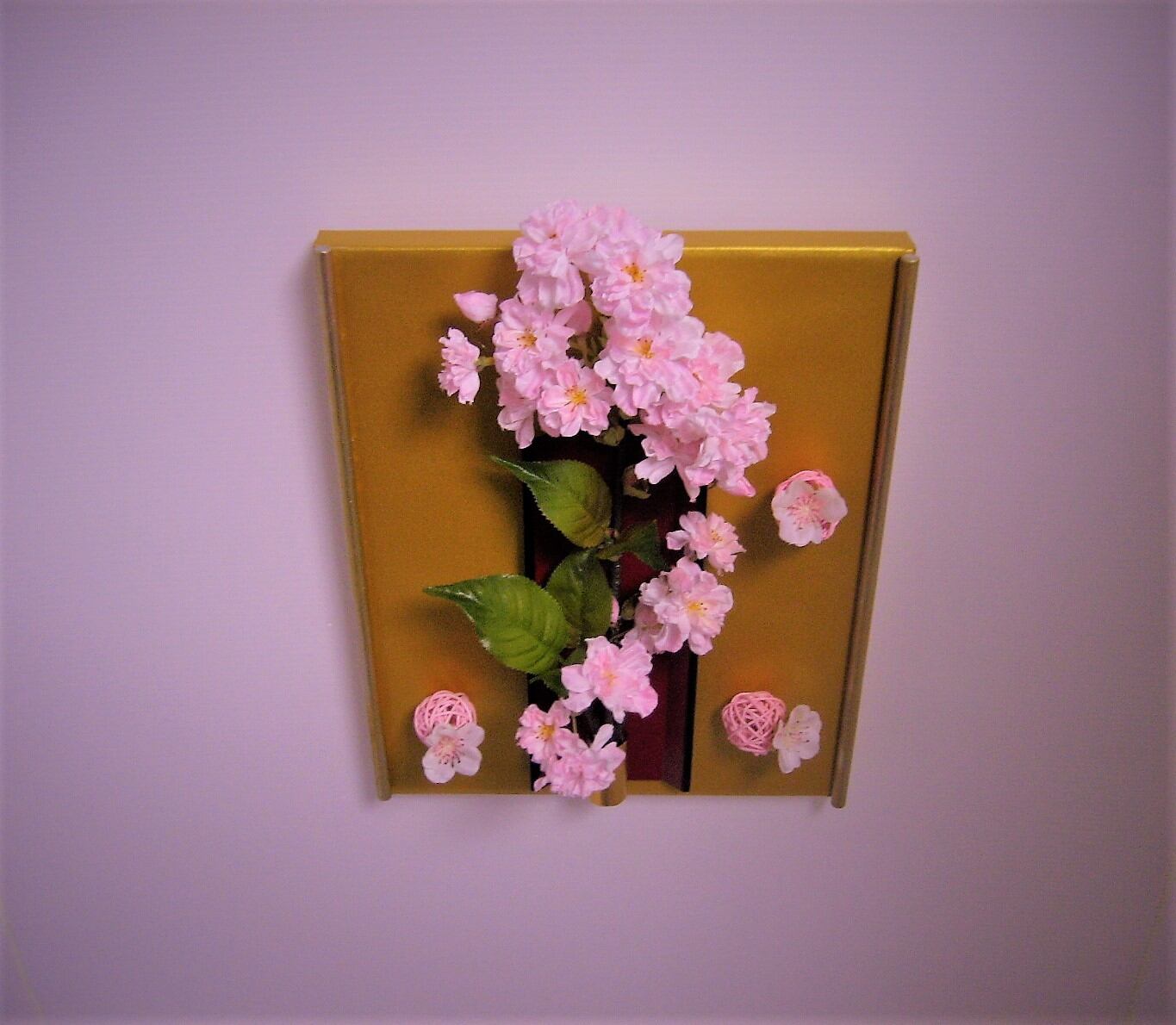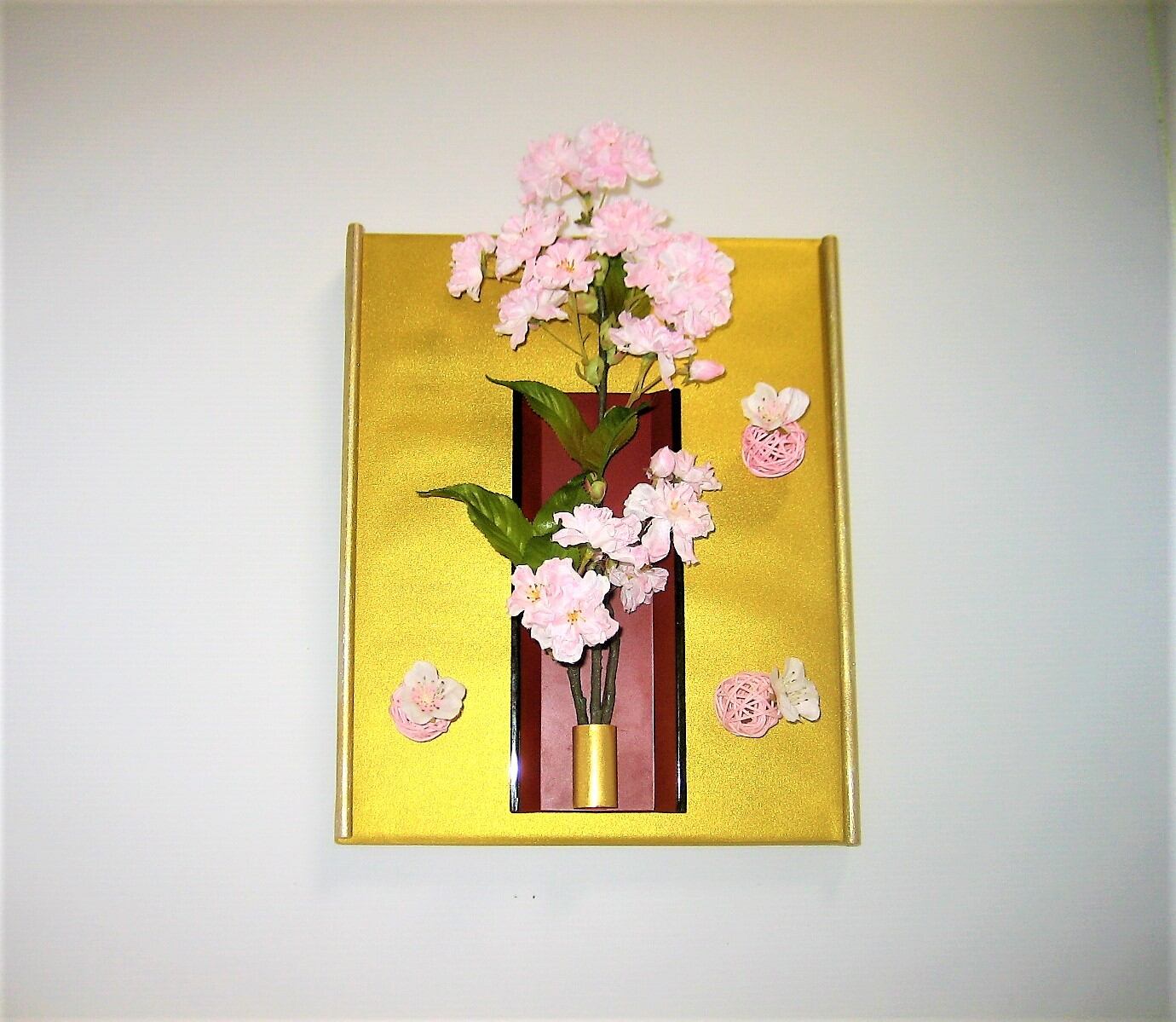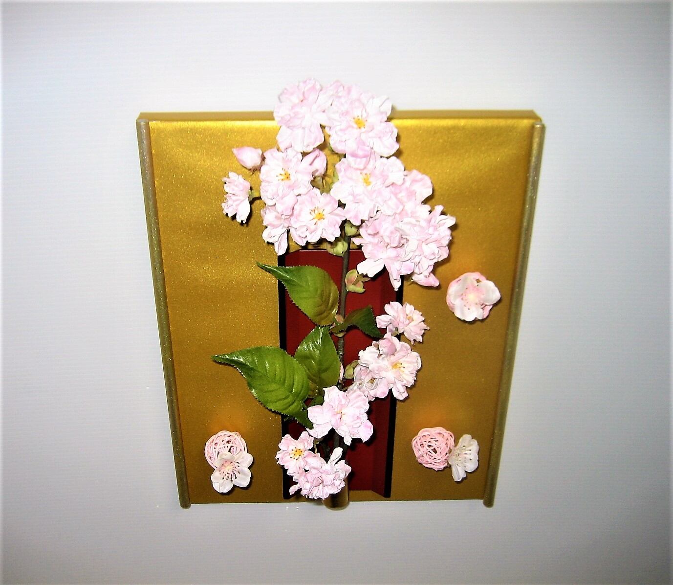 桜の花は枝とのコラボで鑑賞する人の気持ちに和やかさを演出してくれます。桜枝の柔和な優しさと桜花の淡い優しさを表現しました。和テイストの高級感を出すためにバックゴールドを使用しました。 高さ:28cm 幅:22cm 奥行:5cm