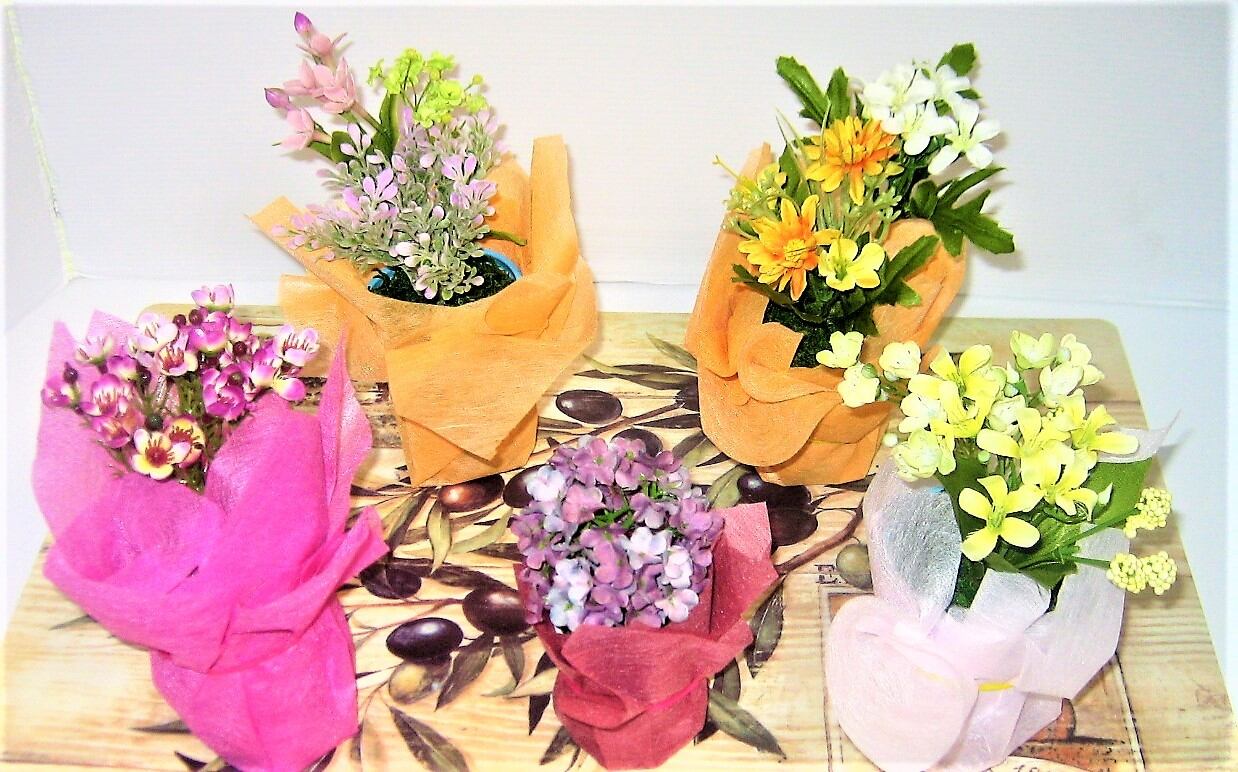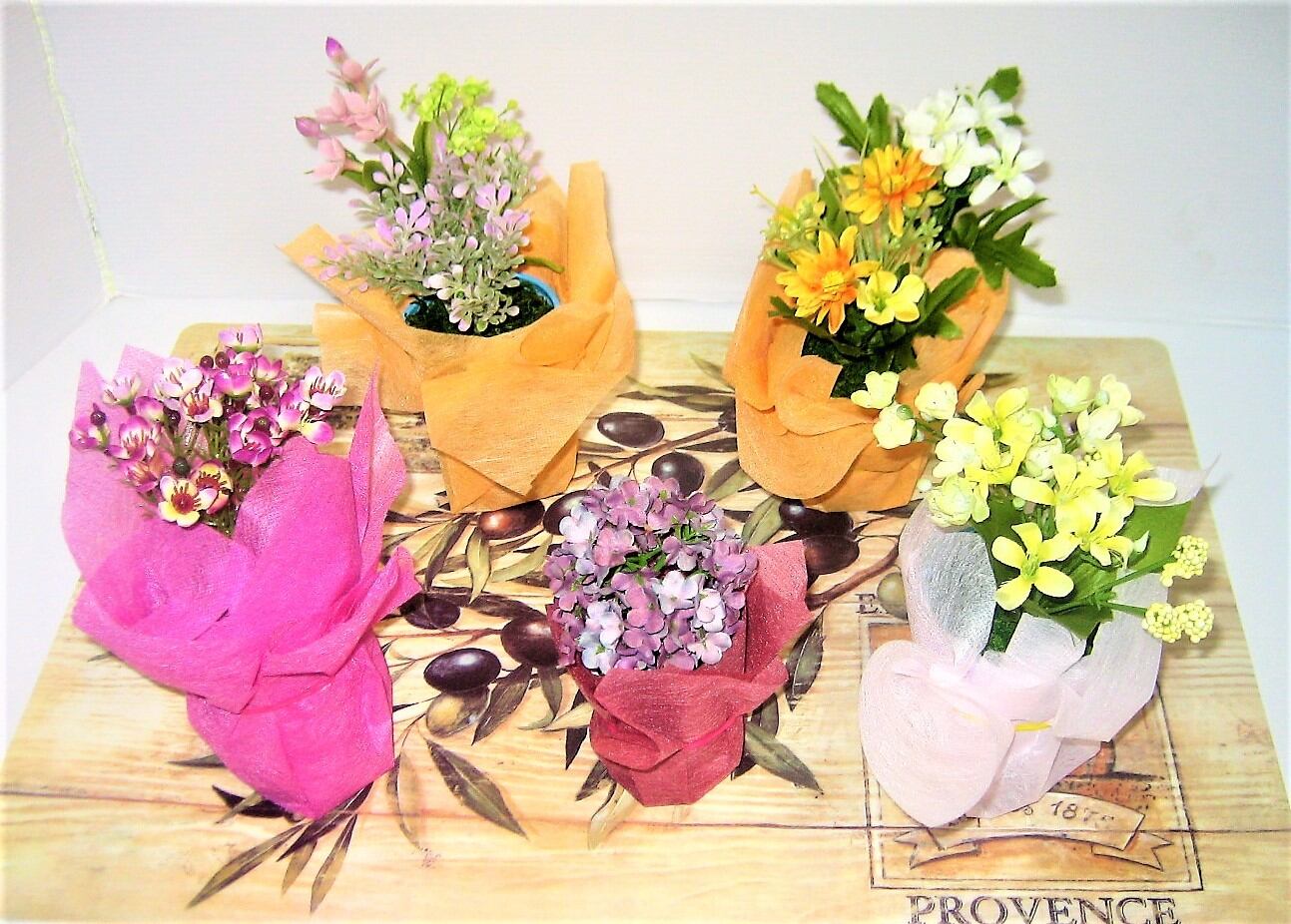 ガーデニングシリーズのアート苗のレフィルフラワーです。 左から①ワックスフラワー(ピンク) ②ティーリーフ(パープル) ③ハイドランジア(パープル) ④ミックスフラワー(オレンジ) ⑤ミックスフラワー(イエロー)※ご注文は番号でお願い致します。