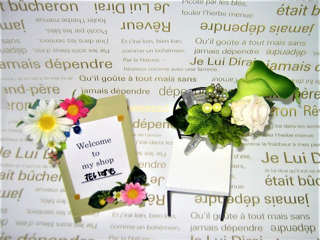 柔和で優しい花びらのカラーリリーが目立つように、また気品あるように作りました。カラーリリーは、アーティフィシャルフラワーです。バラはプリザーブドフラワーです。キャスケードブーケと合わせて頂いてもよろしいですし、単品でコサージュとして式典等でもご利用になれます。